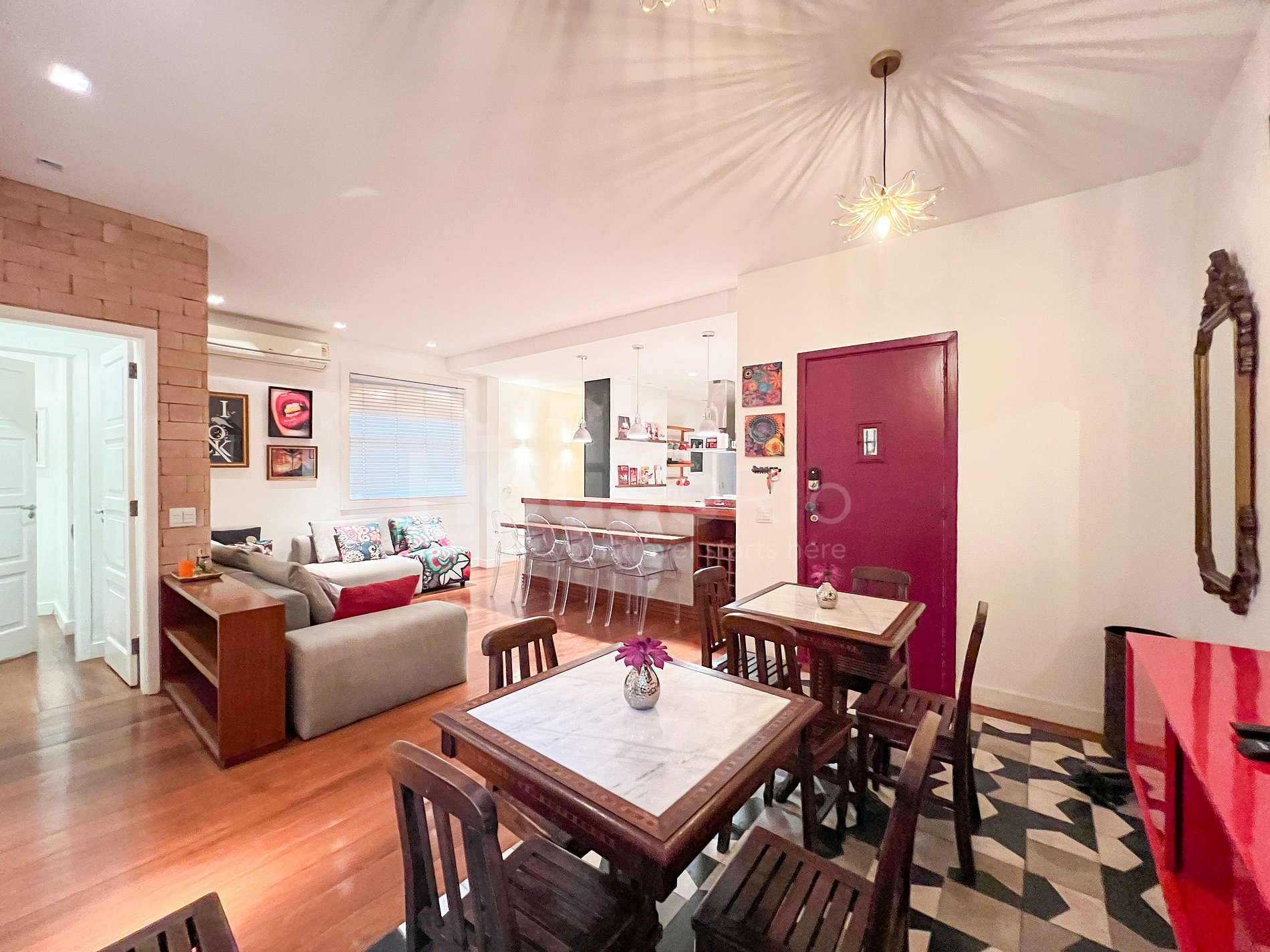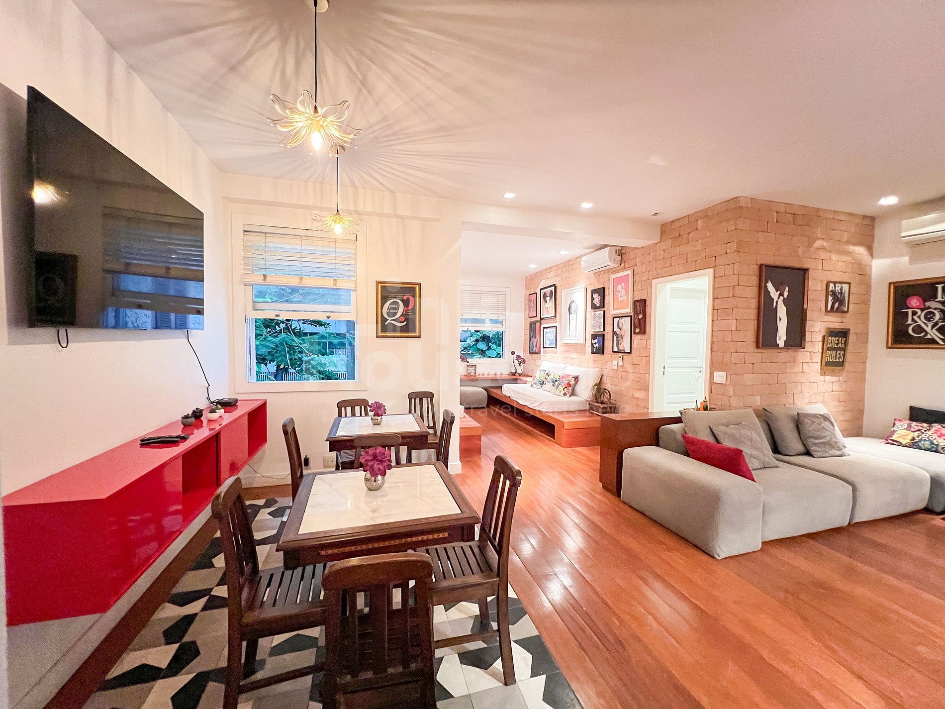 This property uniquely balances the sophistication of Ipanema with the youthful spirit of its neighbors, featuring details that celebrate Rio culture and the urban art of big cities. The living room is spacious and very comfortable, with a large sofa and TV, lighting design and bar tables that combine with urban arts and, at the same time, contrast with the green of the tree-lined street. Additionally, the open-concept kitchen creates a welcoming environment, perfect for sharing memorable meals with family or that couple who also loves to travel. And to rest, two spacious suites, each with its own style, equipped with high quality to guarantee comfort for even the most demanding guests.