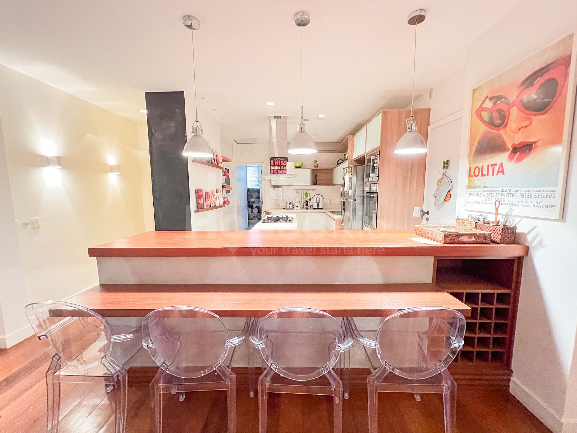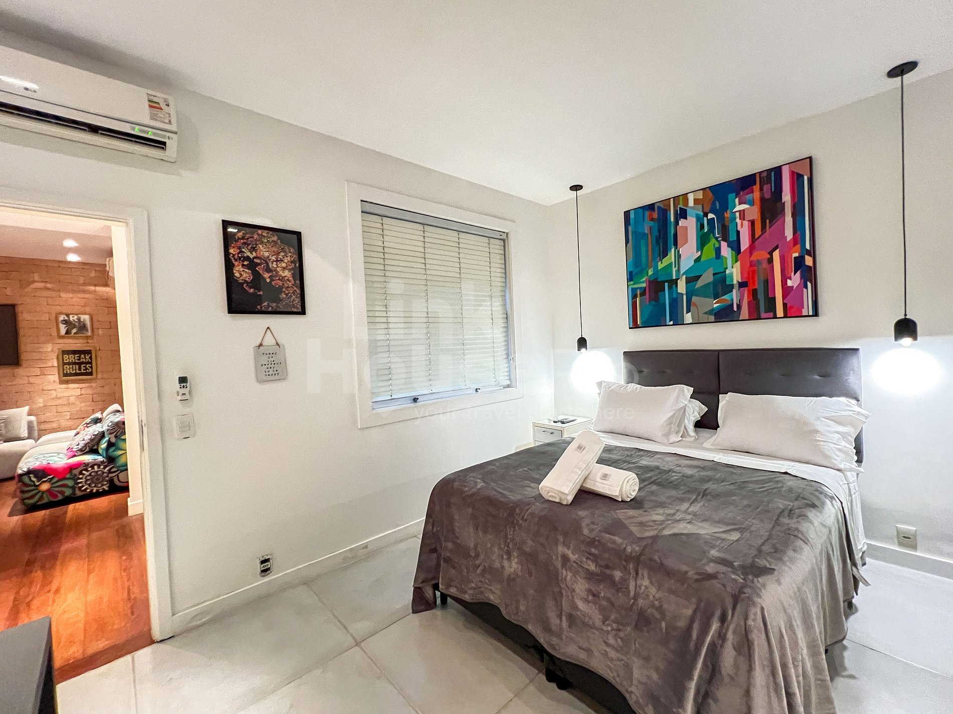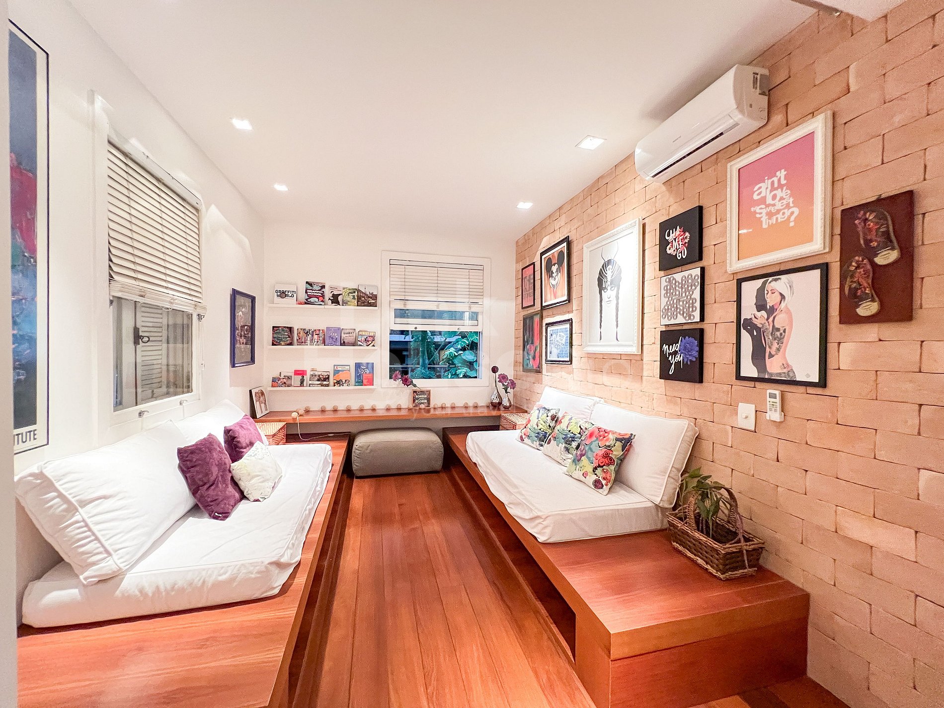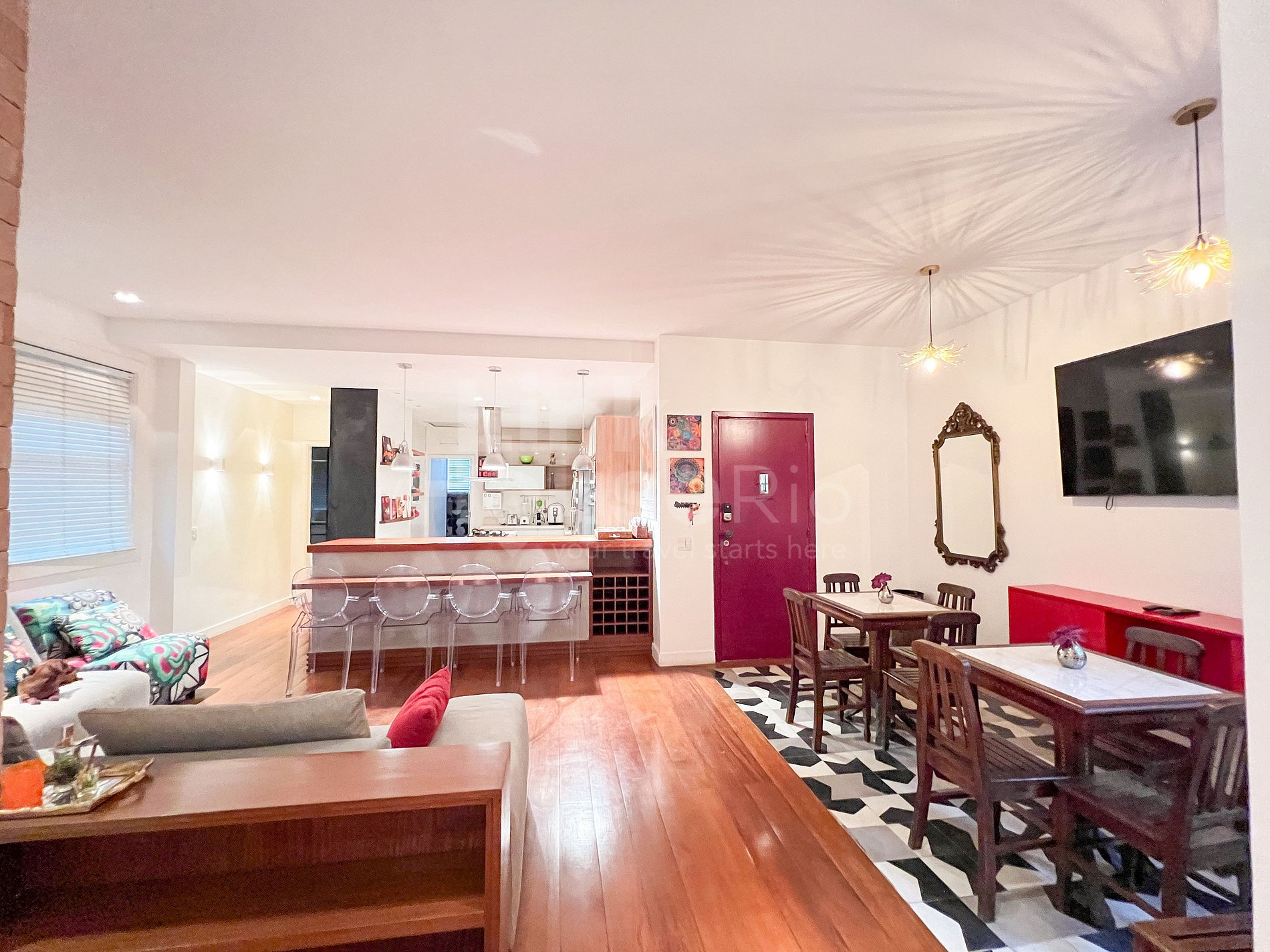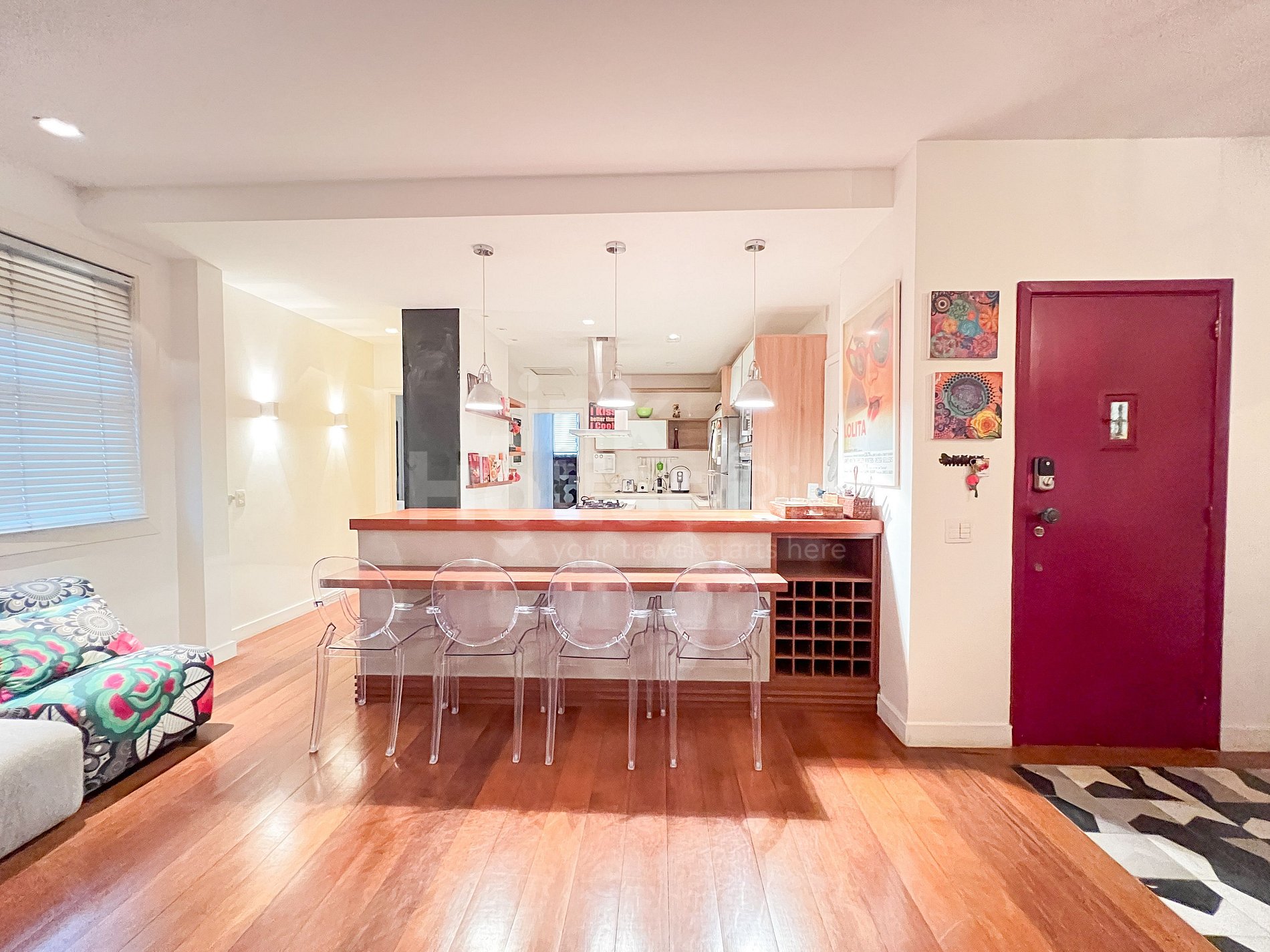 Esta propiedad equilibra de manera única la sofisticación de Ipanema con el espíritu juvenil de sus vecinos, presentando detalles que celebran la cultura de Río y el arte urbano de las grandes ciudades. El salón es amplio y muy cómodo, con un gran sofá y TV, proyecto de iluminación y mesas de bar que combinan con el arte urbano y, al mismo tiempo, contrastan con el verde de la calle arbolada. Además, la cocina de concepto abierto crea un ambiente acogedor, perfecto para compartir comidas memorables en familia o con esa pareja de amigos a la que también le encanta viajar. Y para descansar, dos amplias suites, cada una con su propio estilo, equipadas con alta calidad para garantizar confort hasta para los huéspedes más exigentes.