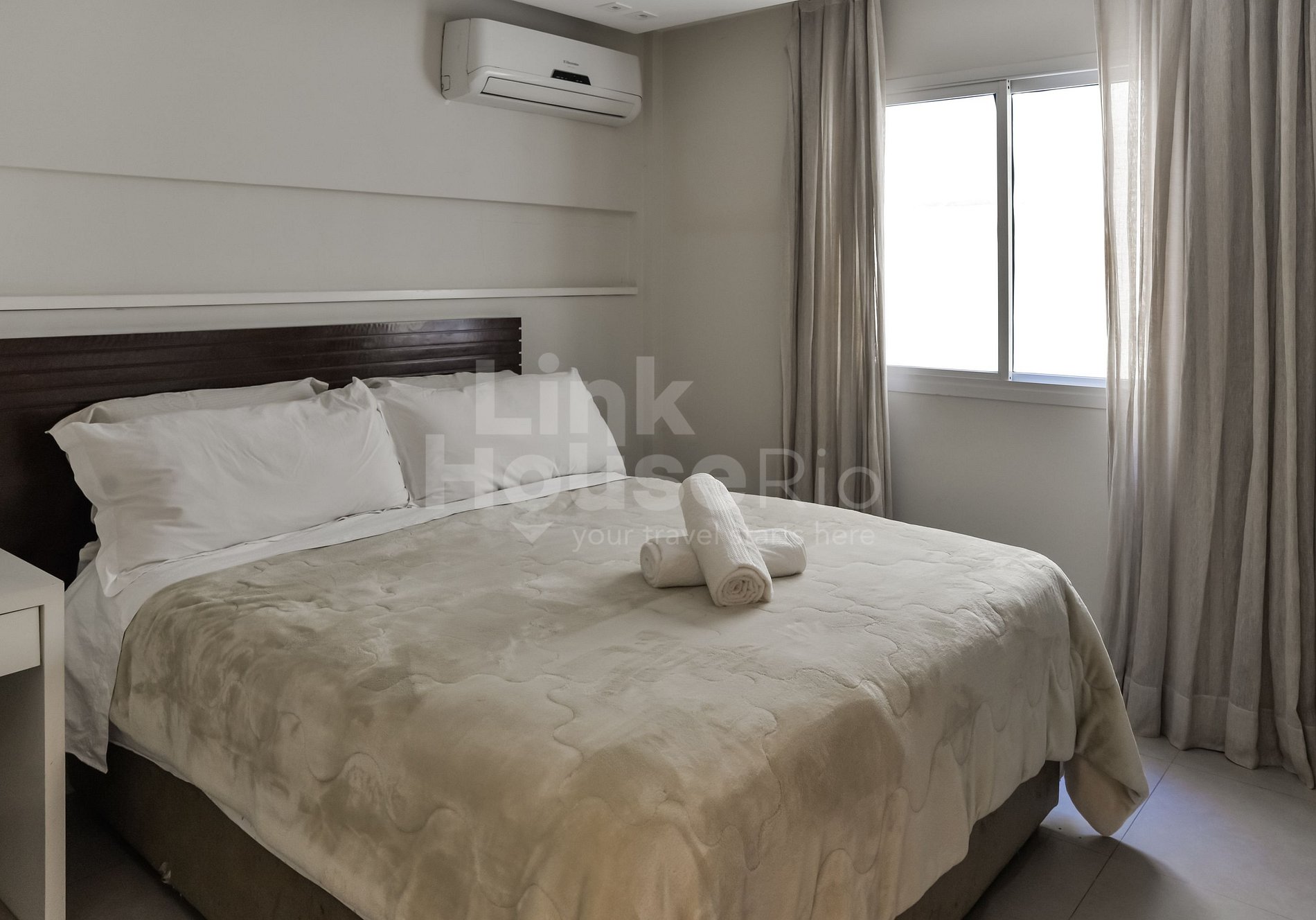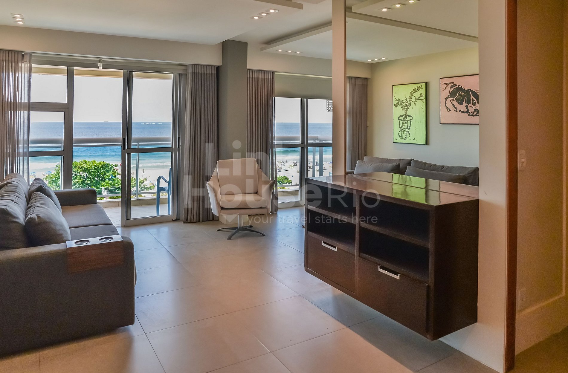 Piso totalmente equipado con 1 dormitorio en suite, cocina completa, acogedora sala de estar y balcón con vista al mar.