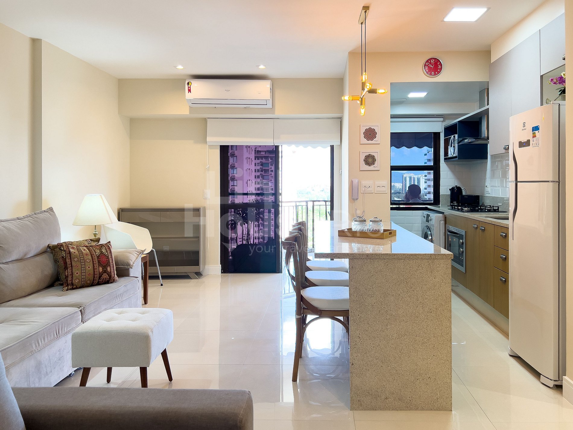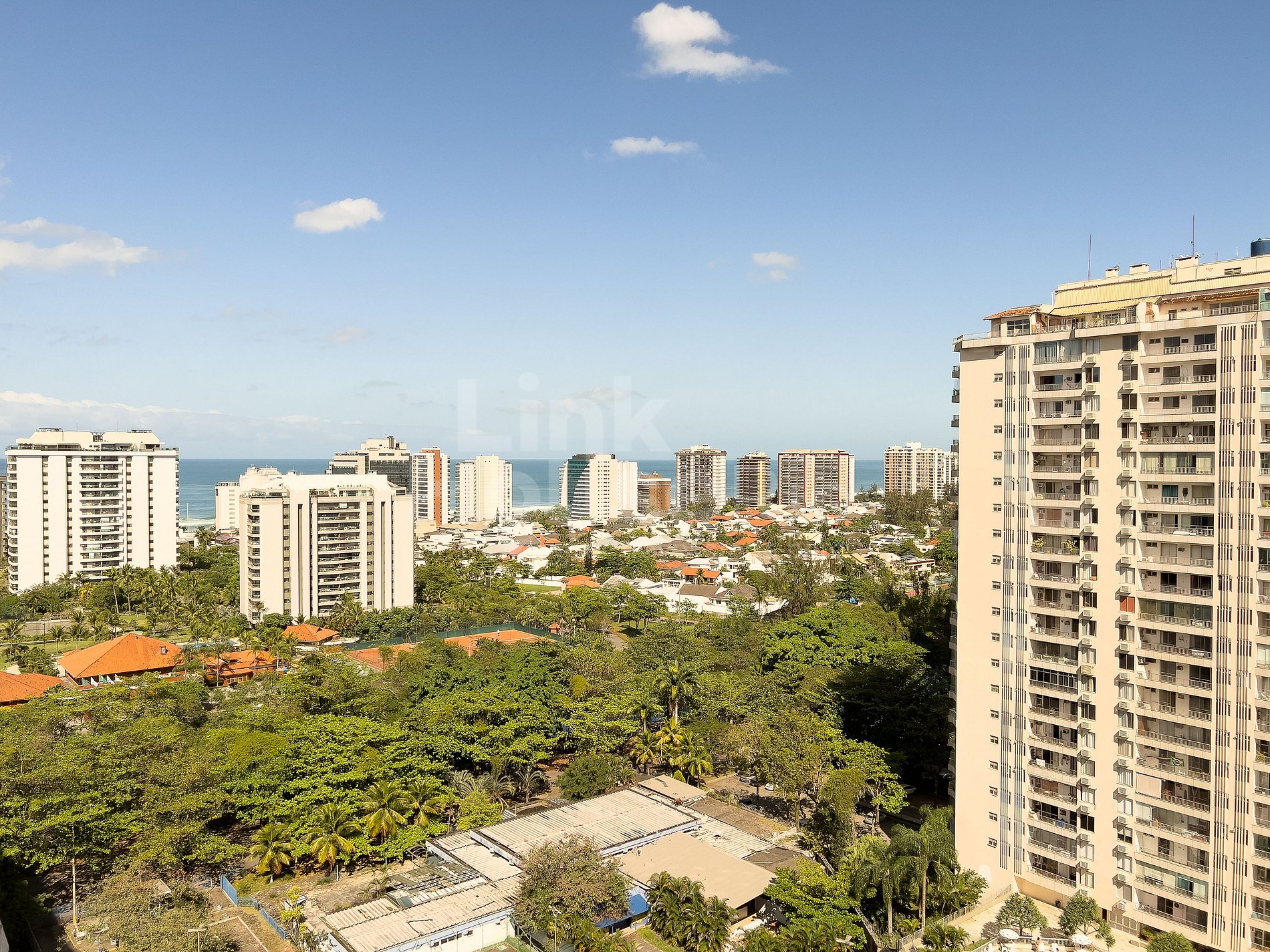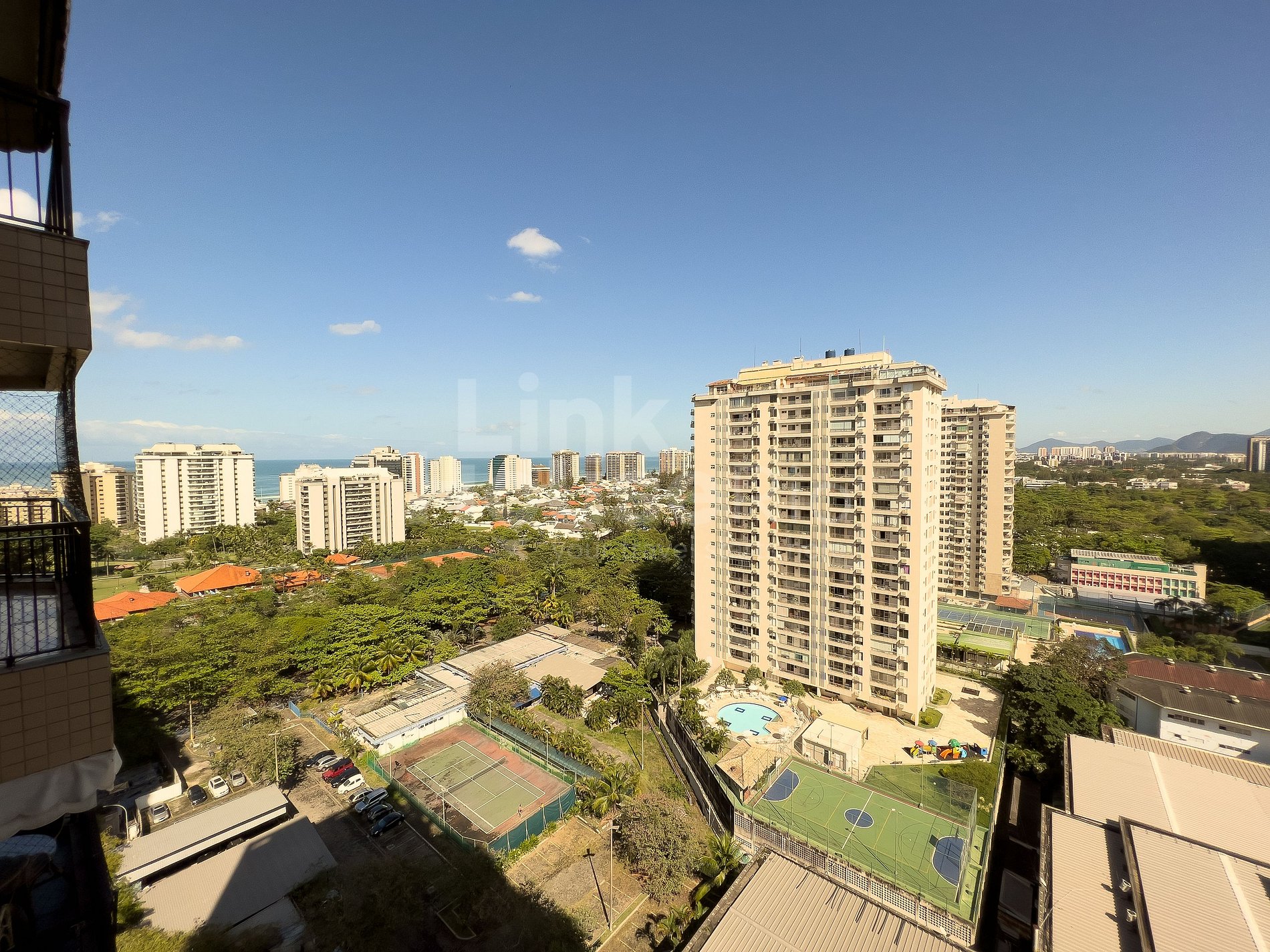 Linda vista panorâmica para os modernos condomínios da Barra em harmonia com a beleza natural da Cidade Maravilhosa. Este Apart Hotel tem muita infraestrutura para garantir que suas férias sejam ótimas, pertinho para ir caminhando até a a praia ou na balsa particular do condomínio. Também pode escolher desfrutar da infraestrutura do local, com piscina e quadra de tenis dentre outras comodidades, ou passear por um shopping vizinho.