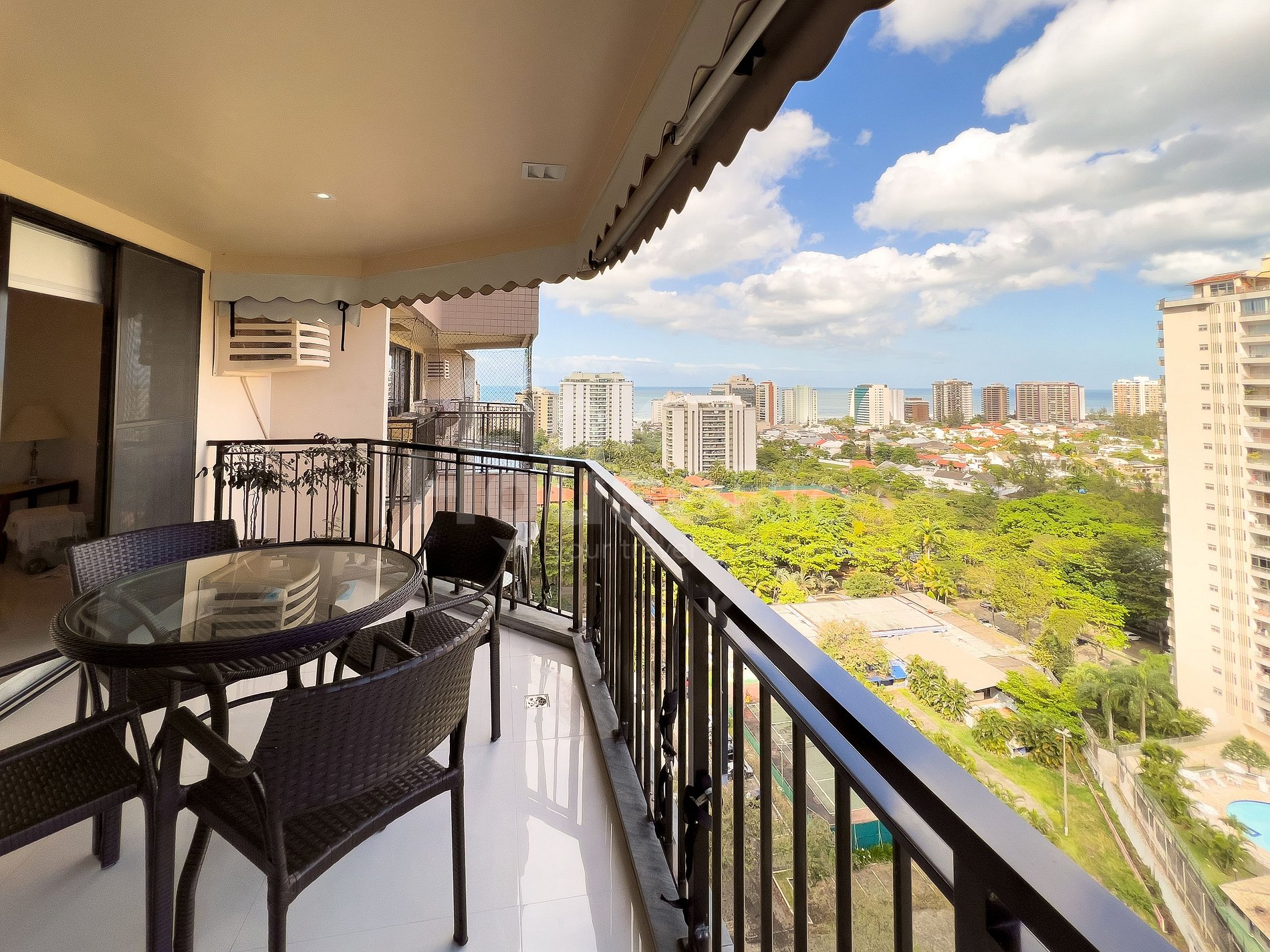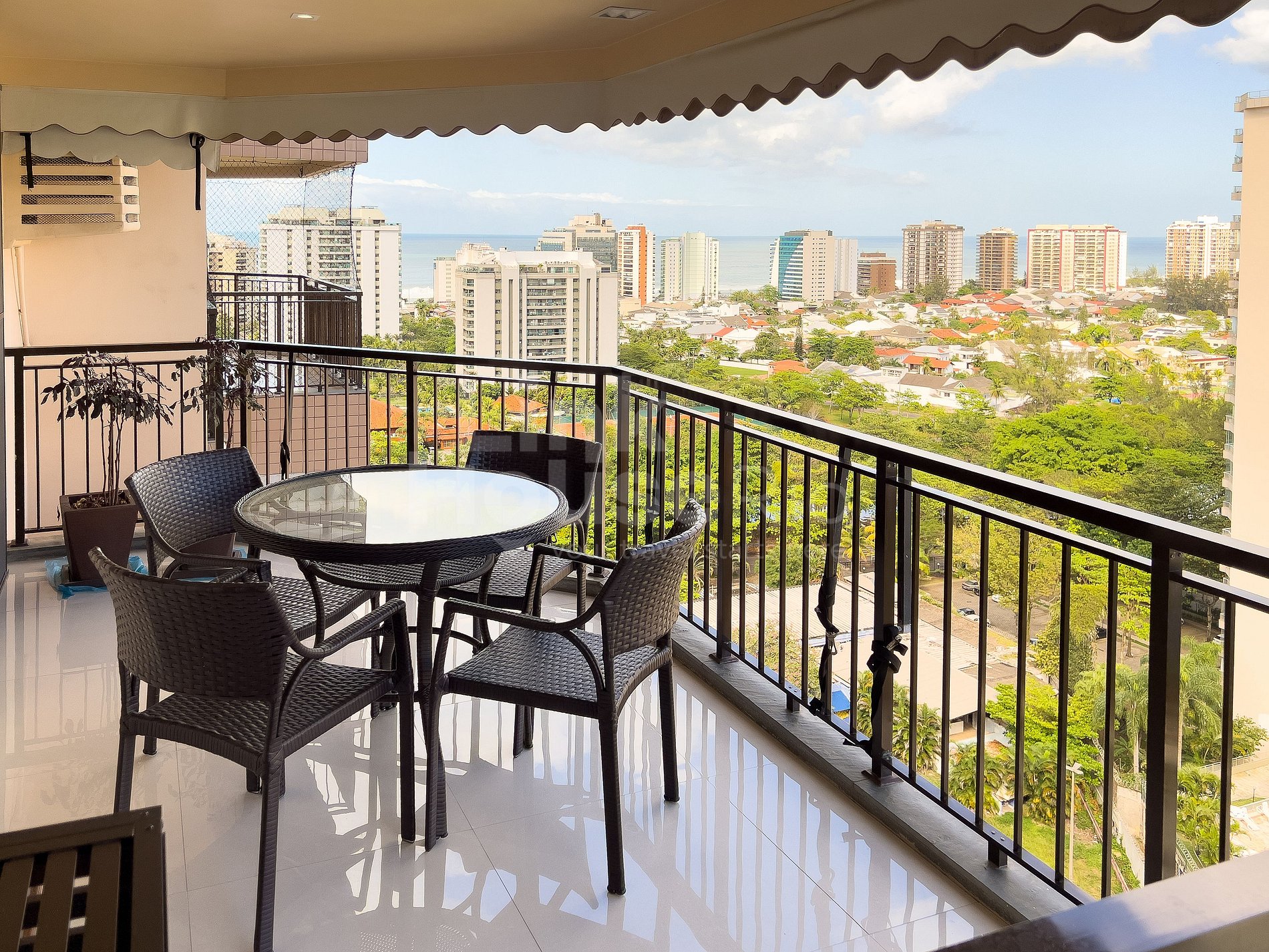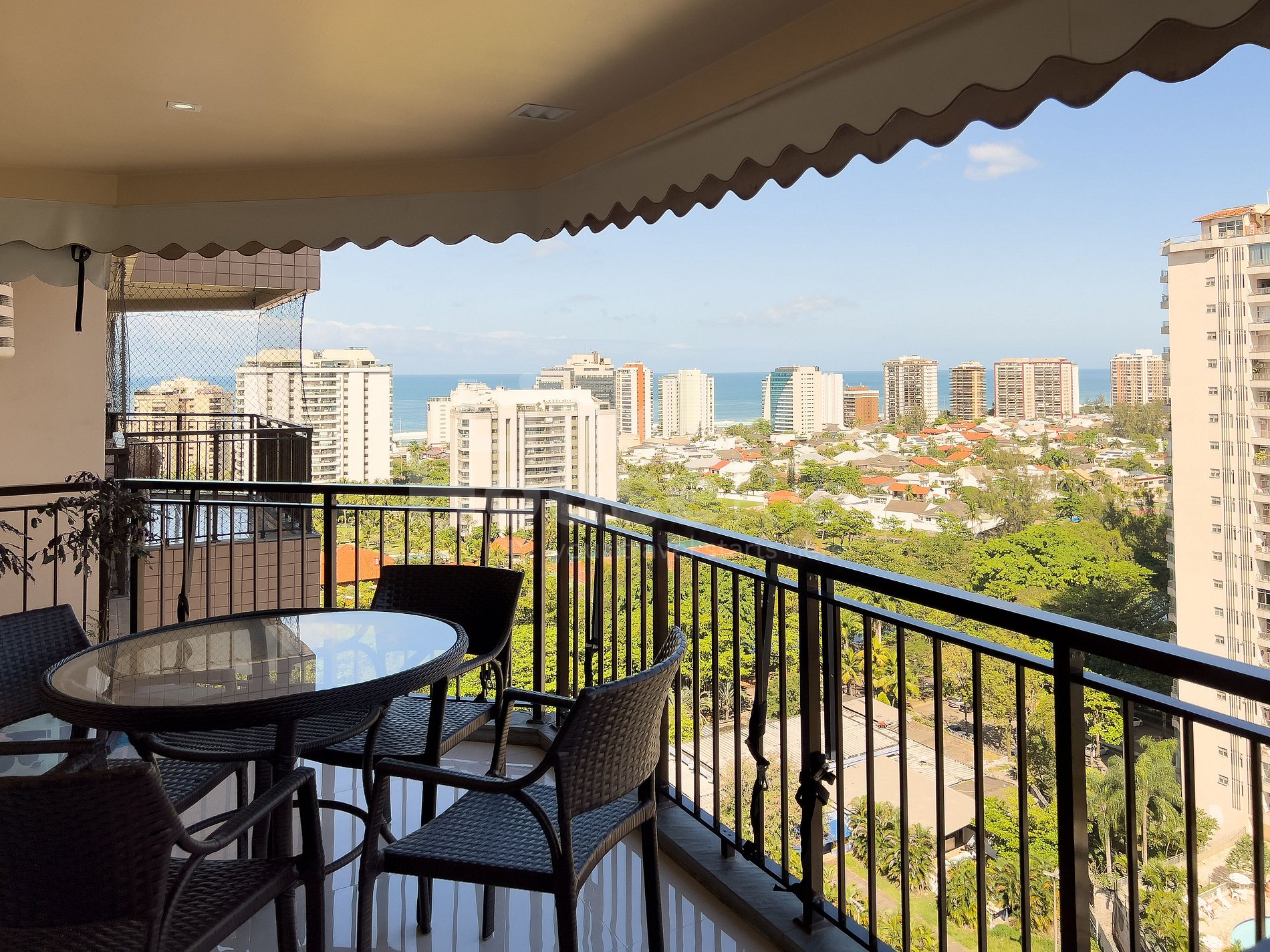 Possui varanda com vista panorâmica da cidade da Barra da Tijuca e com vista ao longe da praia da Barra da Tijuca. Conta com mesa com 4 cadeiras, excelente para sentar e relaxar no café da manhã e/ou tarde sentindo a brisa.