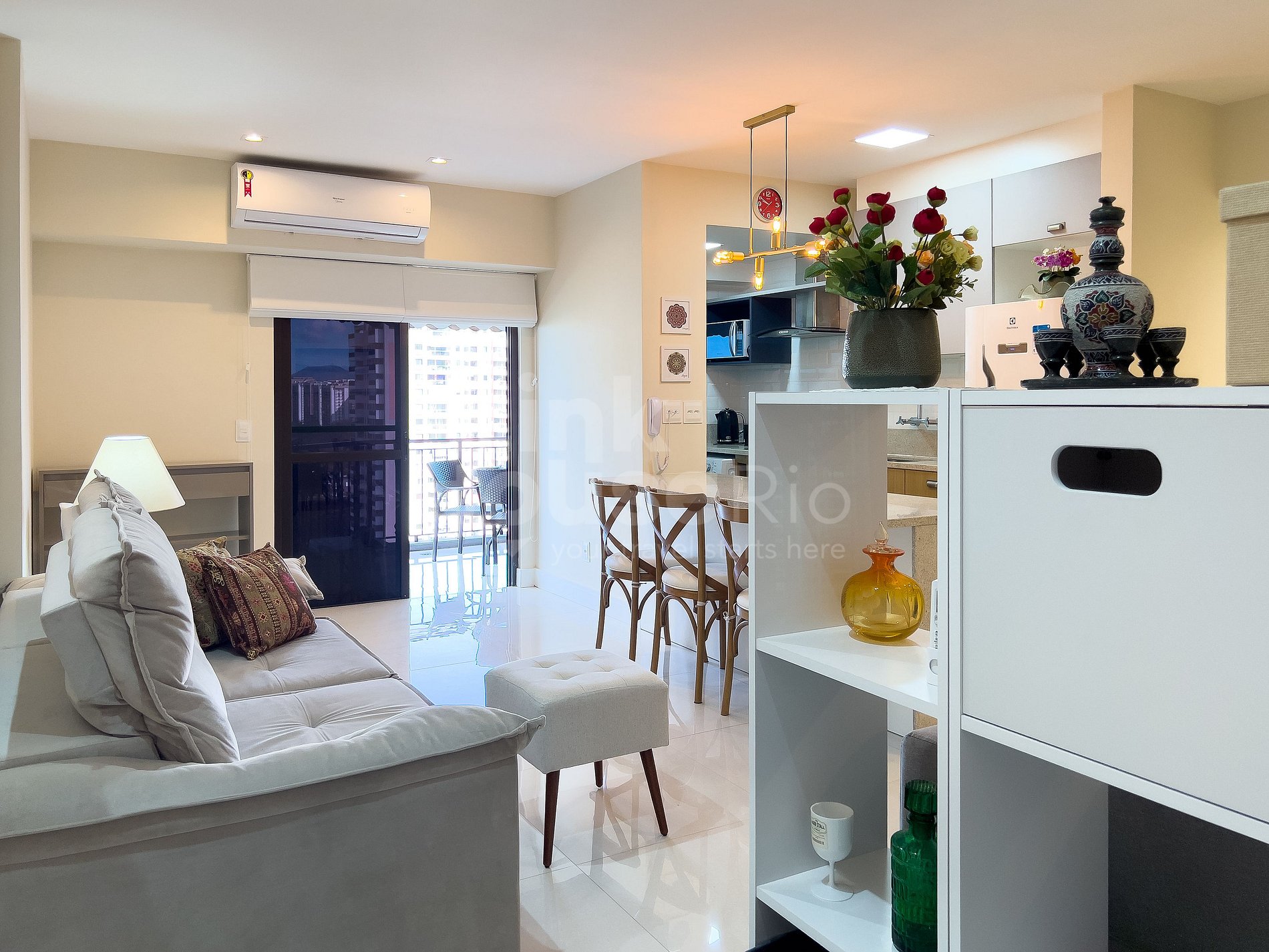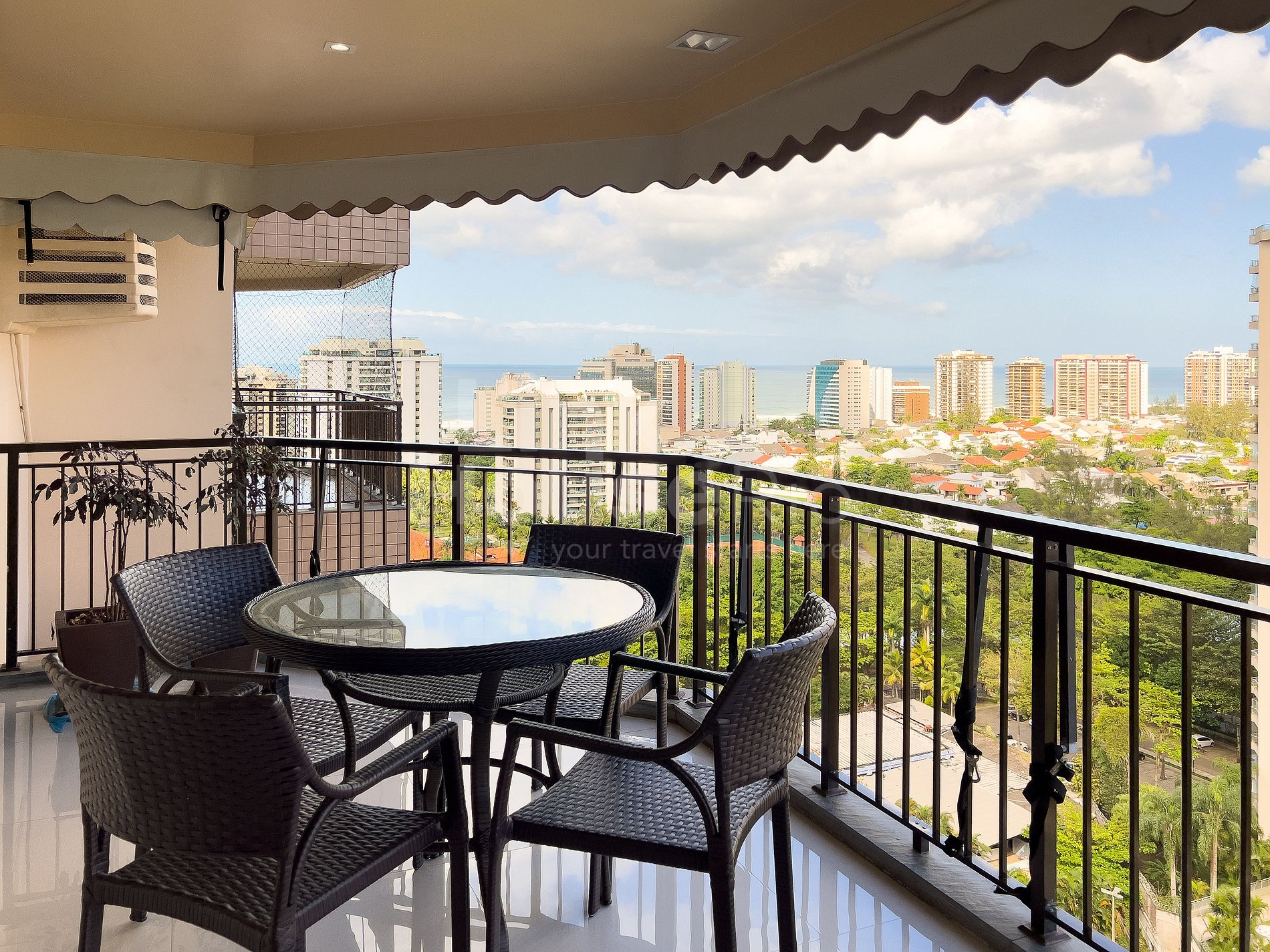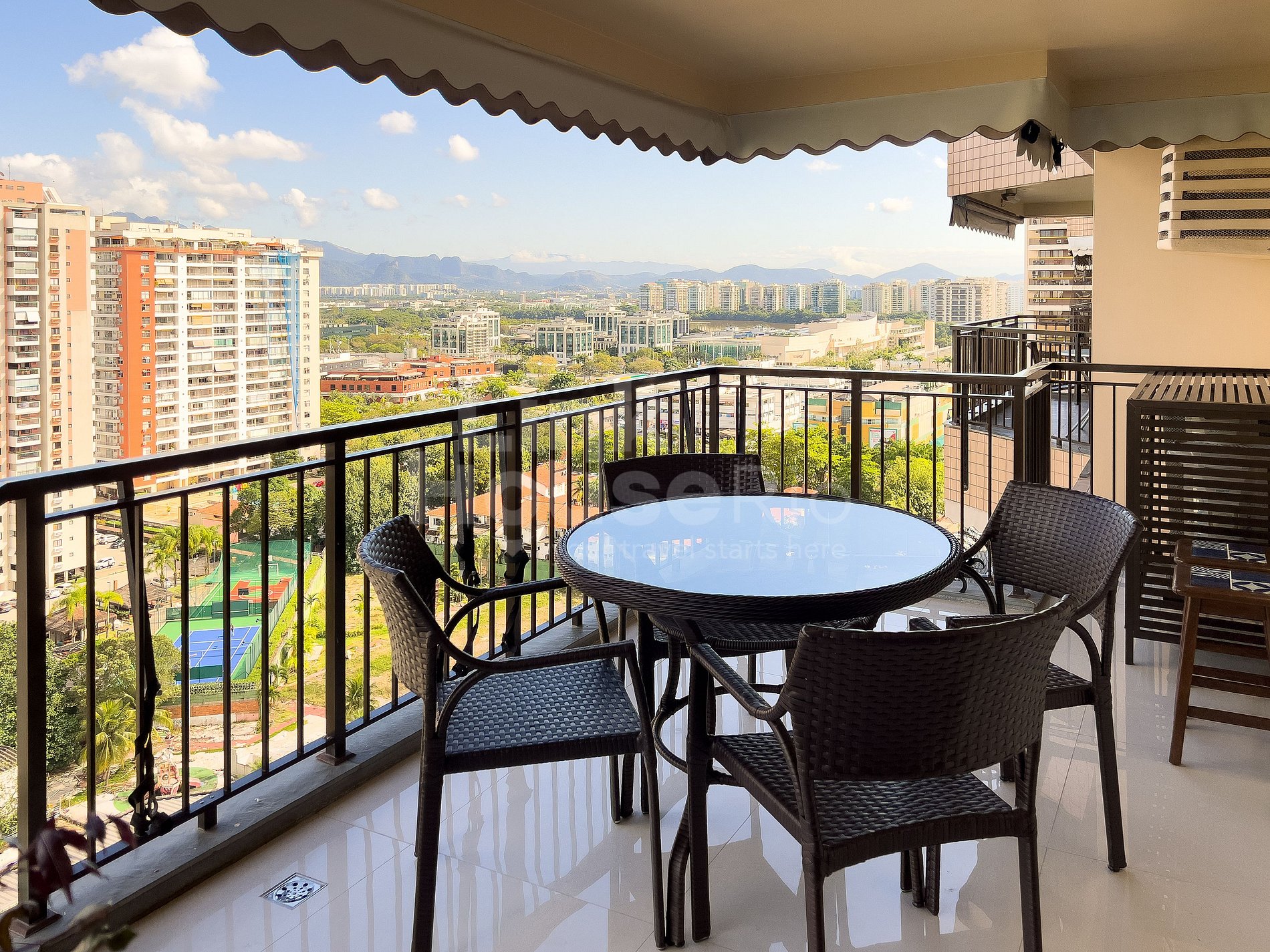 Possui varanda com vista panorâmica da cidade da Barra da Tijuca e com vista ao longe da praia da Barra da Tijuca. Conta com mesa com 4 cadeiras, excelente para sentar e relaxar no café da manhã e/ou tarde sentindo a brisa.
