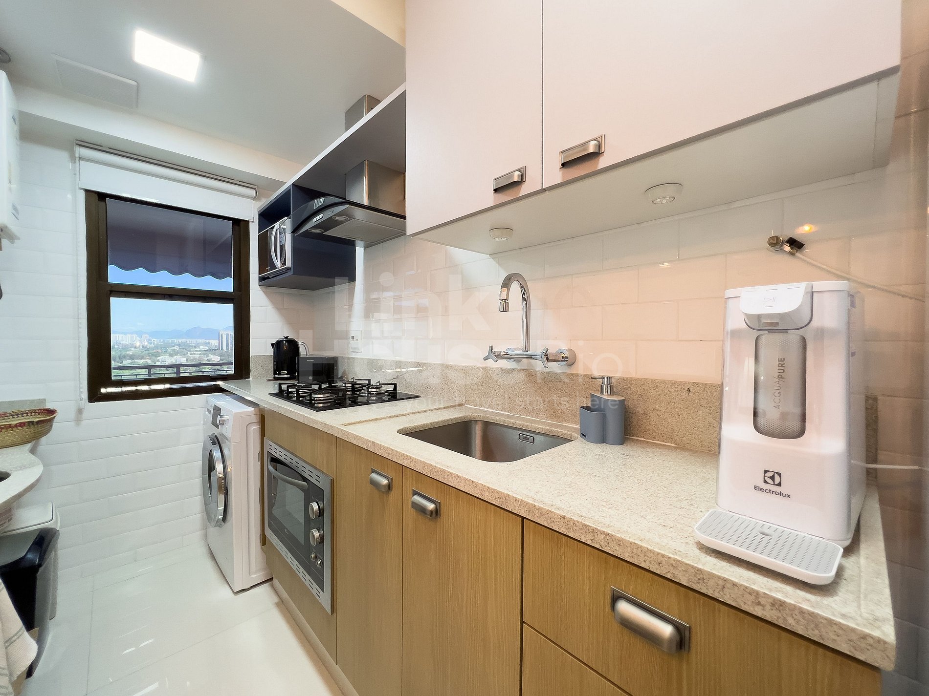 A cozinha é completa, com geladeira, fogão cooktop, geladeira, microondas, máquina de lavar e utensílios gerais de cozinha.