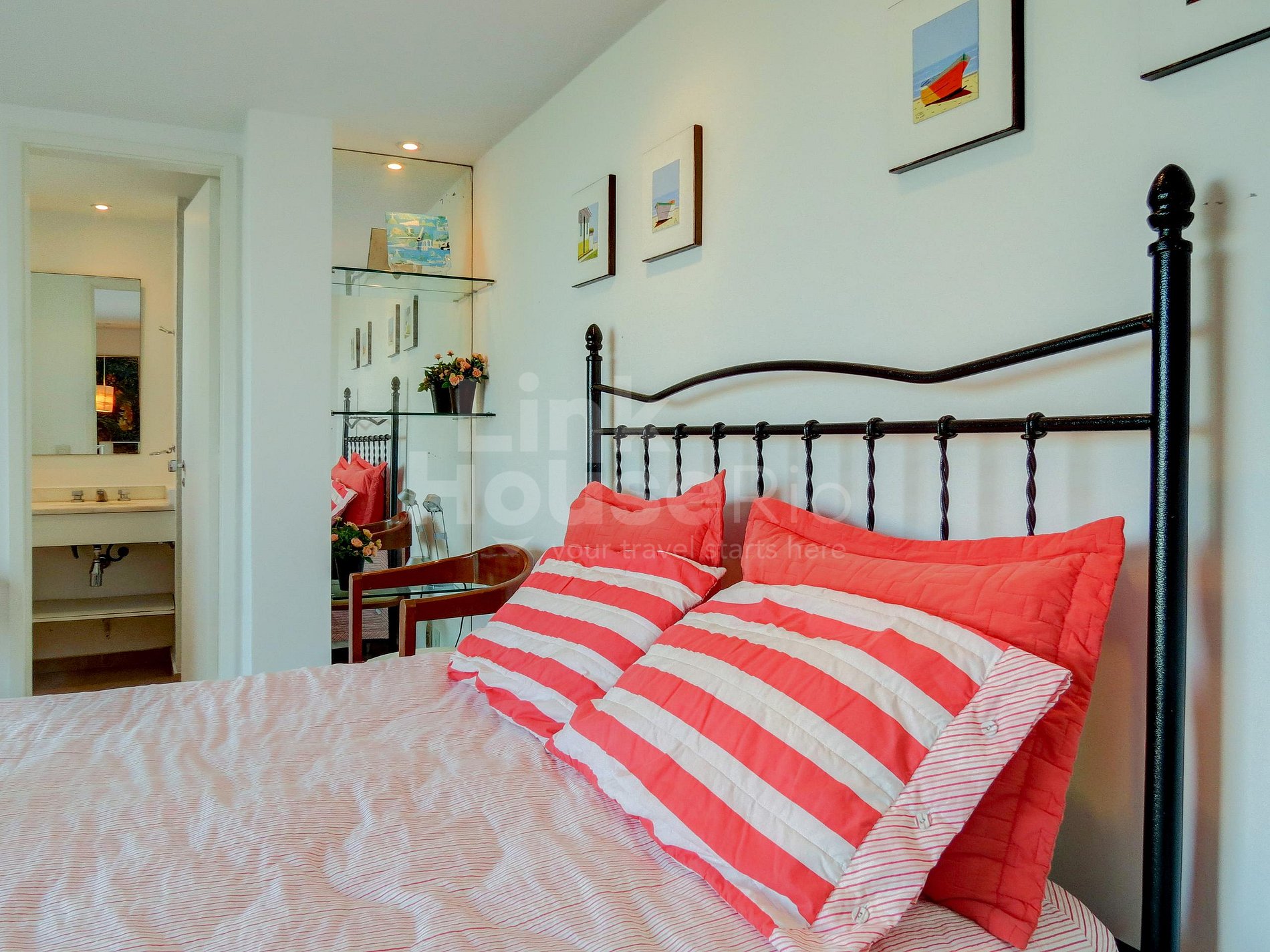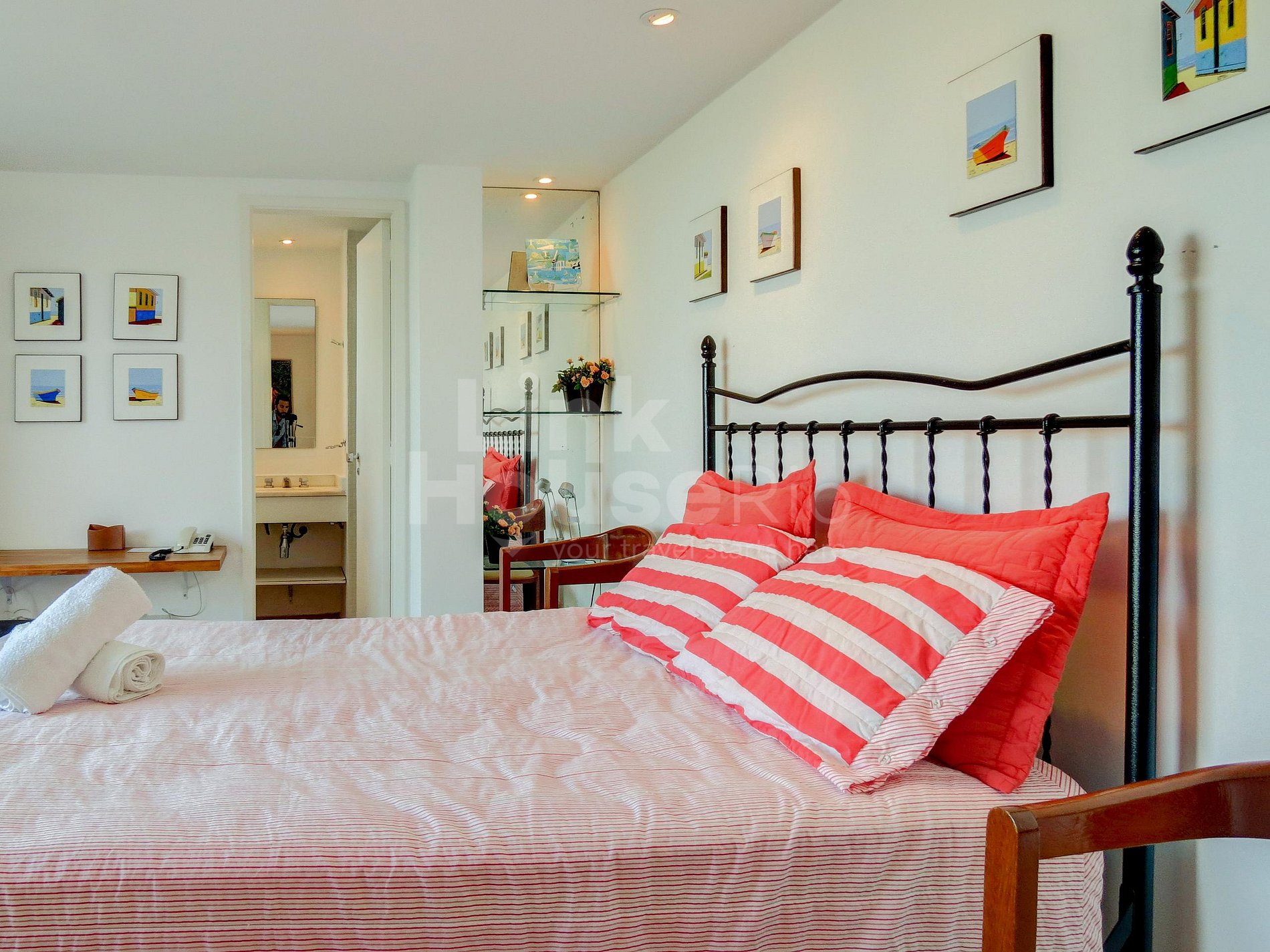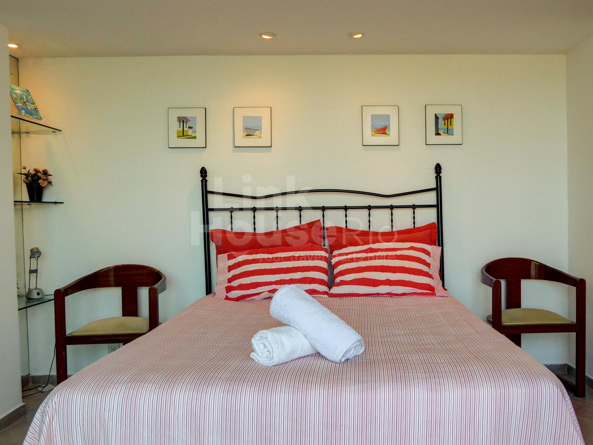 Possui sofá-cama na sala, cozinha completa, ampla sala, 2 quartos no andar de cima (com cama de casal cada). Tem 2 varandas, uma na parte de baixo com vista para a cidade e outra na parte de cima, com vista mar.