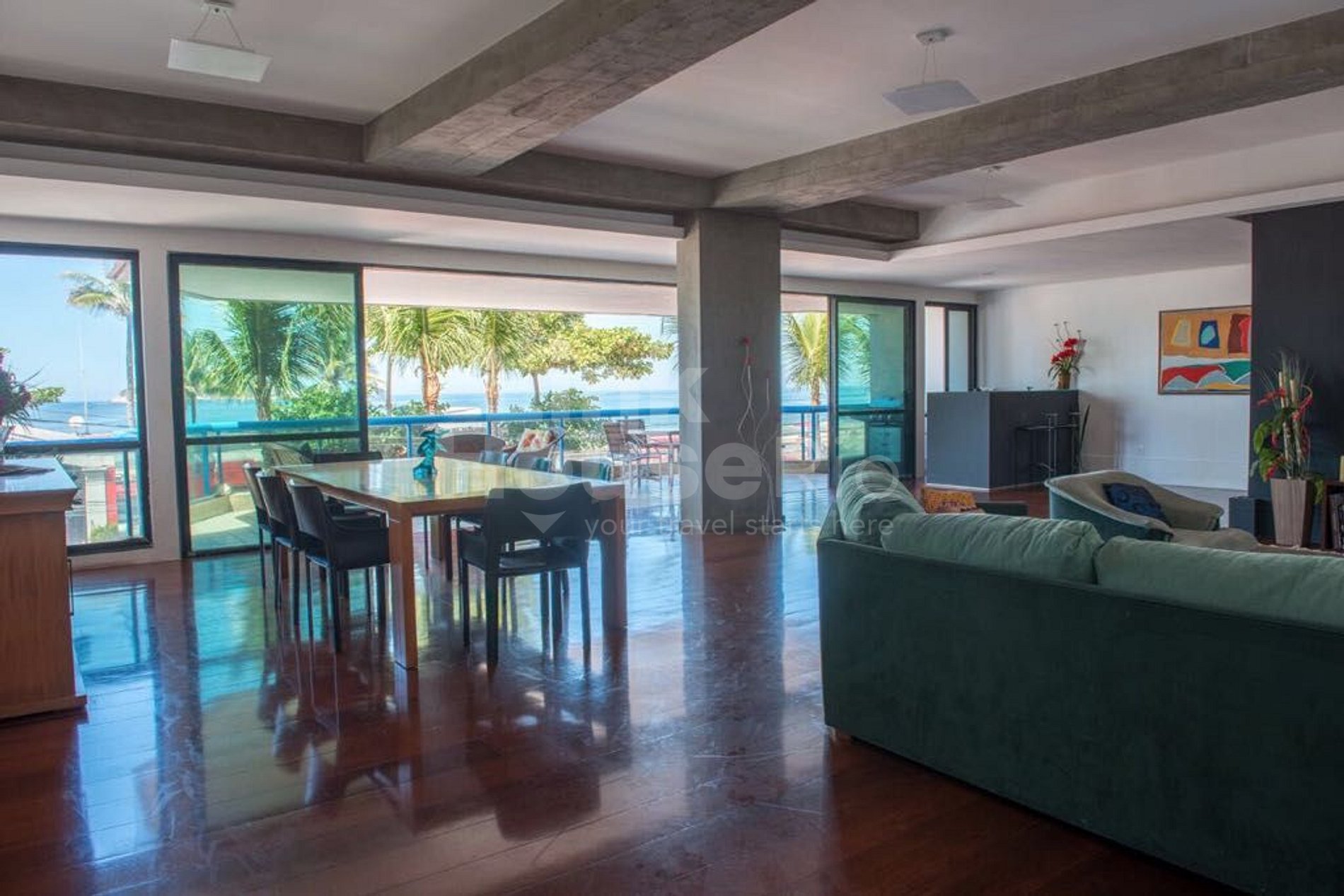 A sala é ampla, possui sofá + poltrona, 1 mesa de jantar para 8 pessoas e uma incrível varanda com vista mar. Excelente opção para tomar café da manhã e/ou tarde apreciando a vista e sentindo a brisa do mar!